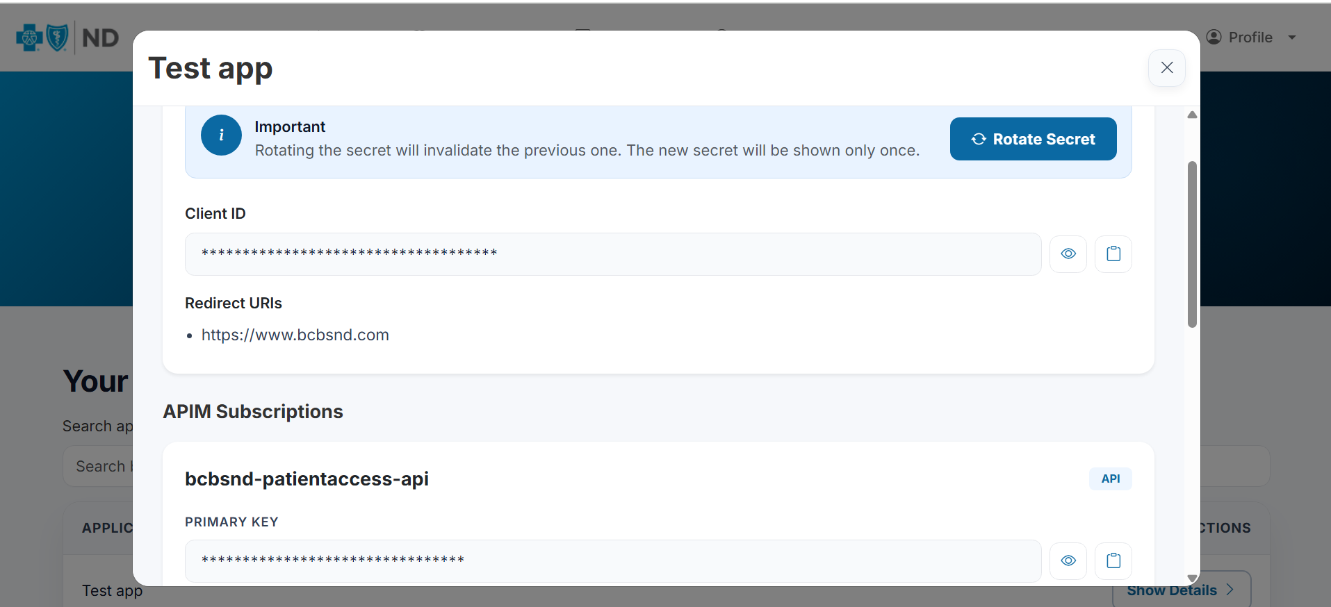 If you need a new client secret, open your application under My Applications and click Rotate Secret. Copy the newly generated secret and store it securely.